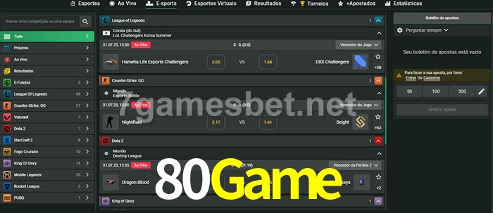 O 80Game oferece uma grande seleção de opções de apostas em e-sports com probabilidades competitivas